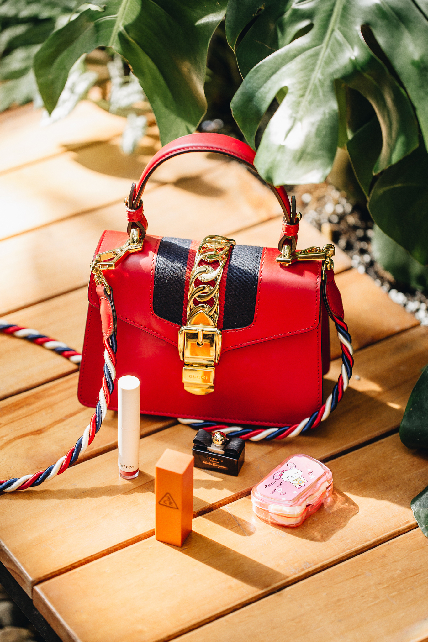 Tự nhận mình là người khá giản dị nên túi xách của Mâu Thủy chỉ chứa đựng những món vật dụng rất cơ bản như nước hoa, son, khăn giấy… Trong chiếc túi nhỏ xinh ấy, quan trọng nhất không thể thiếu “vũ khí” son môi, đâu chỉ là một mà đến hai thỏi. Son lì của 3CE và son dưỡng của Innisfree là sự “hợp tác” hoàn hảo giúp môi luôn căng mọng, đầy sức sống. Điều này cho thấy nàng Á hậu rất quan tâm và chăm chút cho đôi môi của mình.