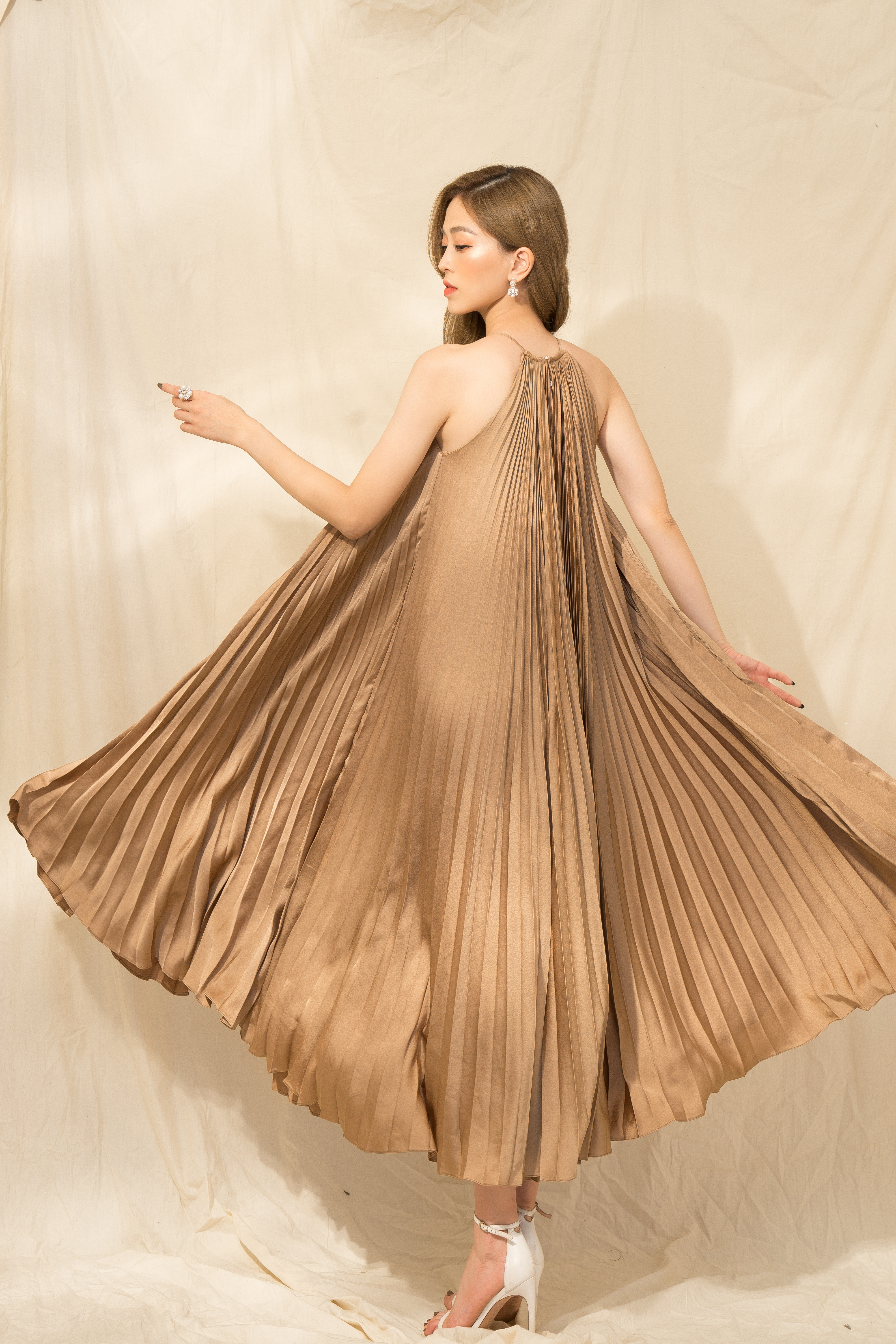 Chiếc váy dập pli mang tông màu neutral xu hướng mang đến nét thanh tú, sang trọng cho nàng hậu.