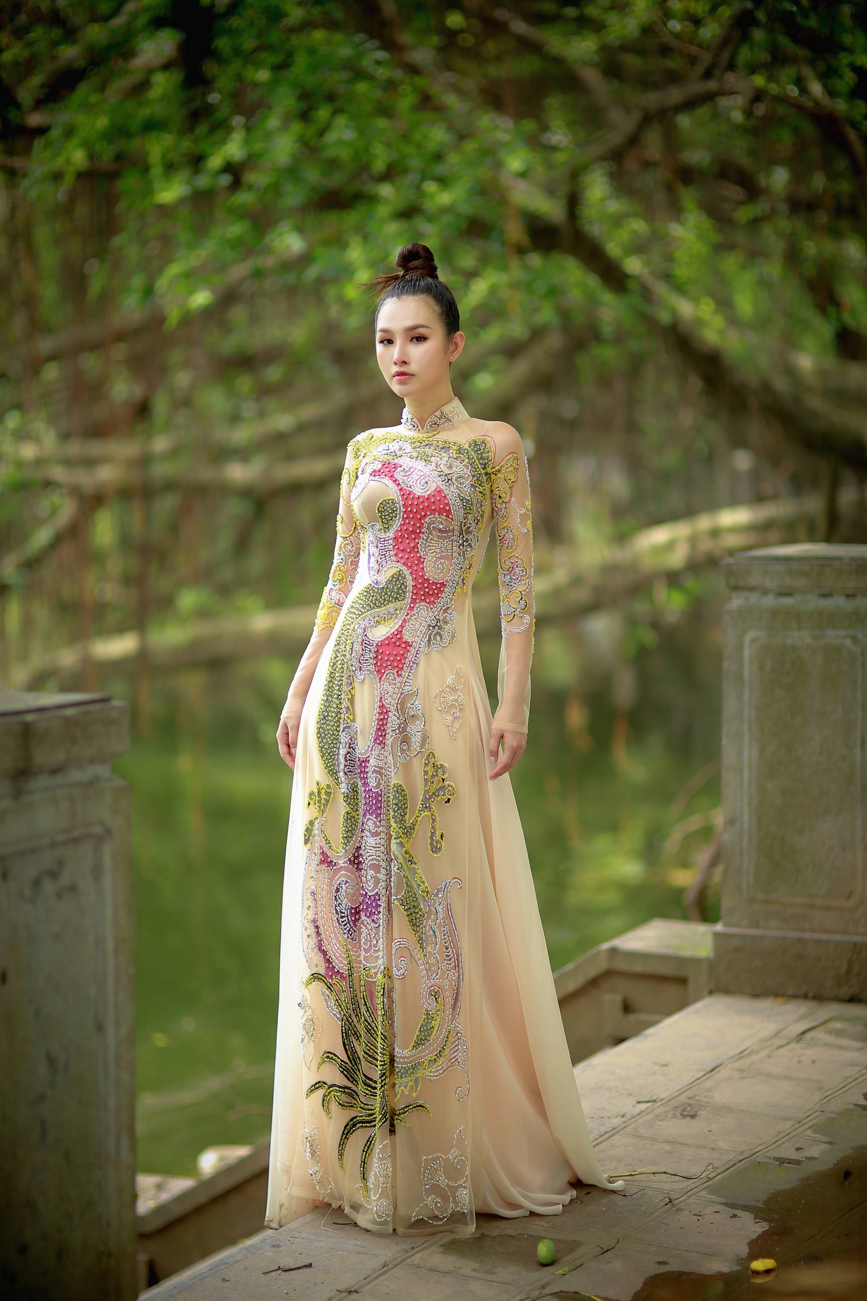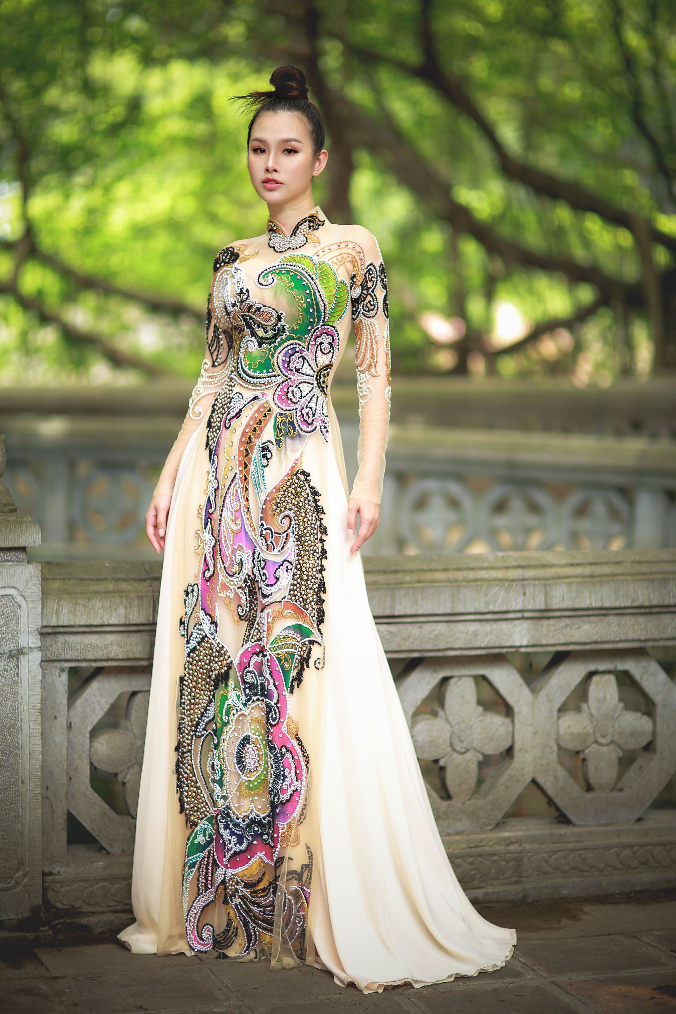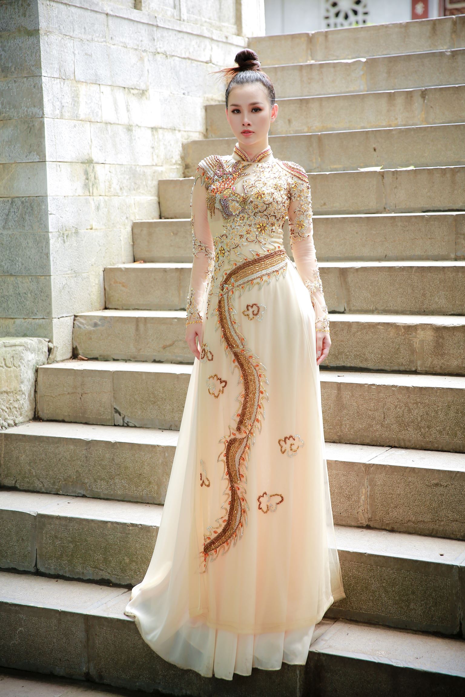 Có kinh nghiệm làm mẫu từ lâu nên Thanh Trang nắm bắt rất nhanh ý tưởng của bộ trang phục. Thần thái của người đẹp được đánh giá là rất phù hợp với các mẫu áo dài mang họa tiết rồng phượng, được đính kết cầu kỳ, mang vẻ quyền lực như các nữ hoàng xưa.