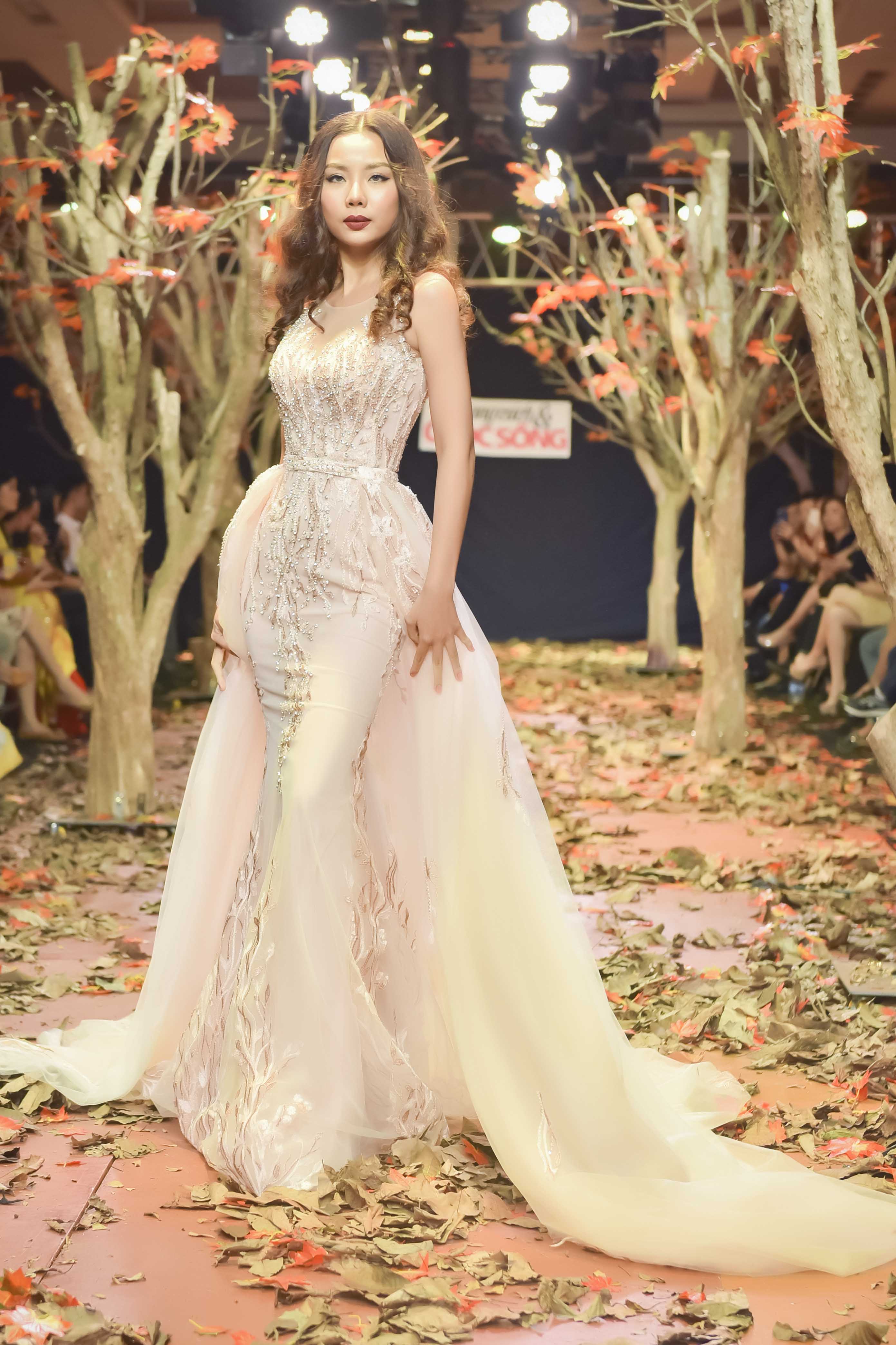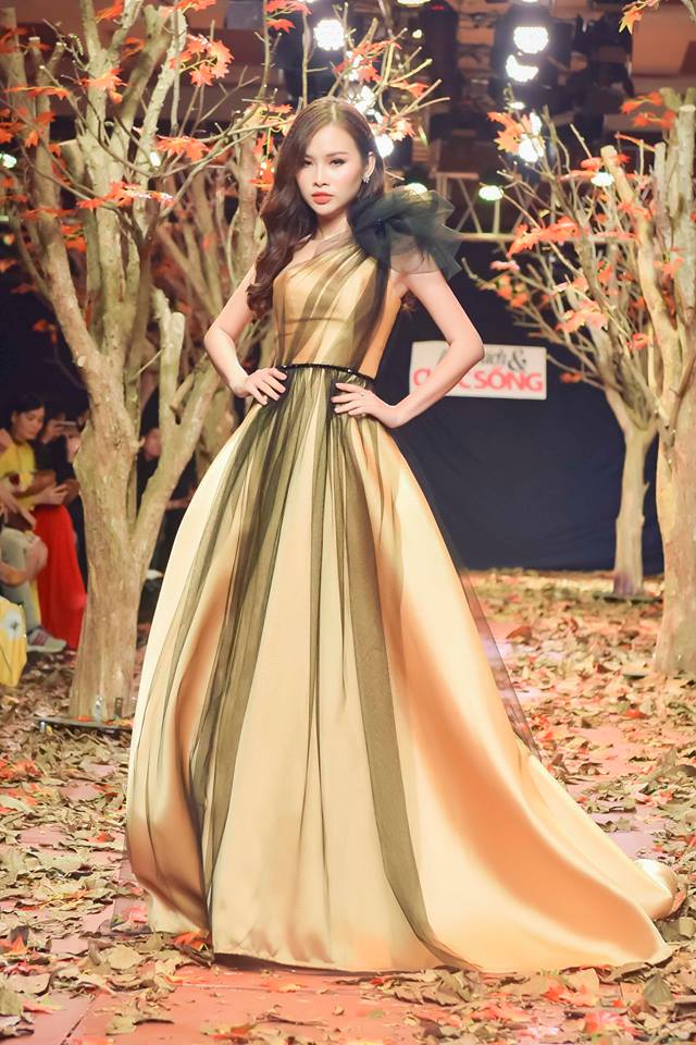 Á Hậu Thanh Trang như nàng thơ bước ra từ truyện cổ tích với vẻ đẹp lãng mạn, kiêu kỳ. Cô diện trên mình thiết kế đậm chất thu mang màu vàng của lá, màu nâu đen của thân cây.