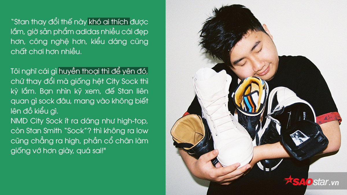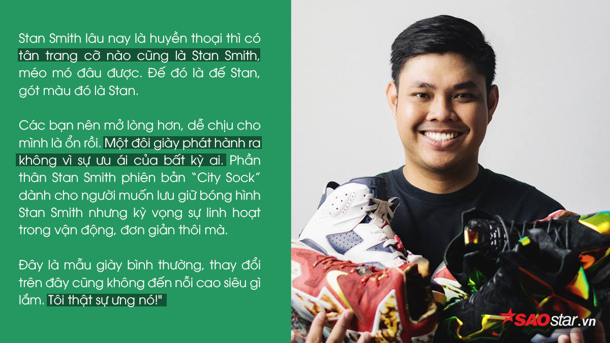 Khi được hỏi về đứa “con lai” này, Nam Phạm - admin Thần Kinh Giày cho biết: “Cá nhân tôi thấy màu áo mới của Stan Smith sẽ hoà hợp phong cách giới trẻ. Hơn nữa, chất liệu Primeknit vốn dĩ thoải mái nên có làm gì cả ngày cũng chẳng lo”.