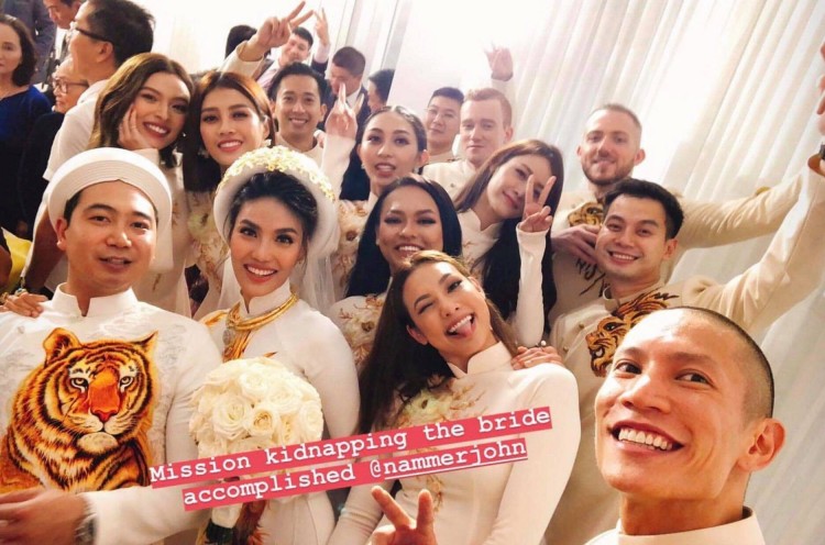 Cặp đôi duyên dáng, hạnh phúc trong vòng tay bè bạn, người thân.