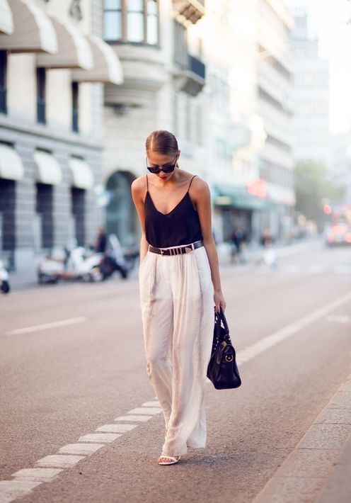 Cuối tuần dạo phố, phóng khoáng hơn một chút với kiểu quần satin nhẹ nhàng, mát mẻ với áo hai dây hoặc sơ mi mỏng.