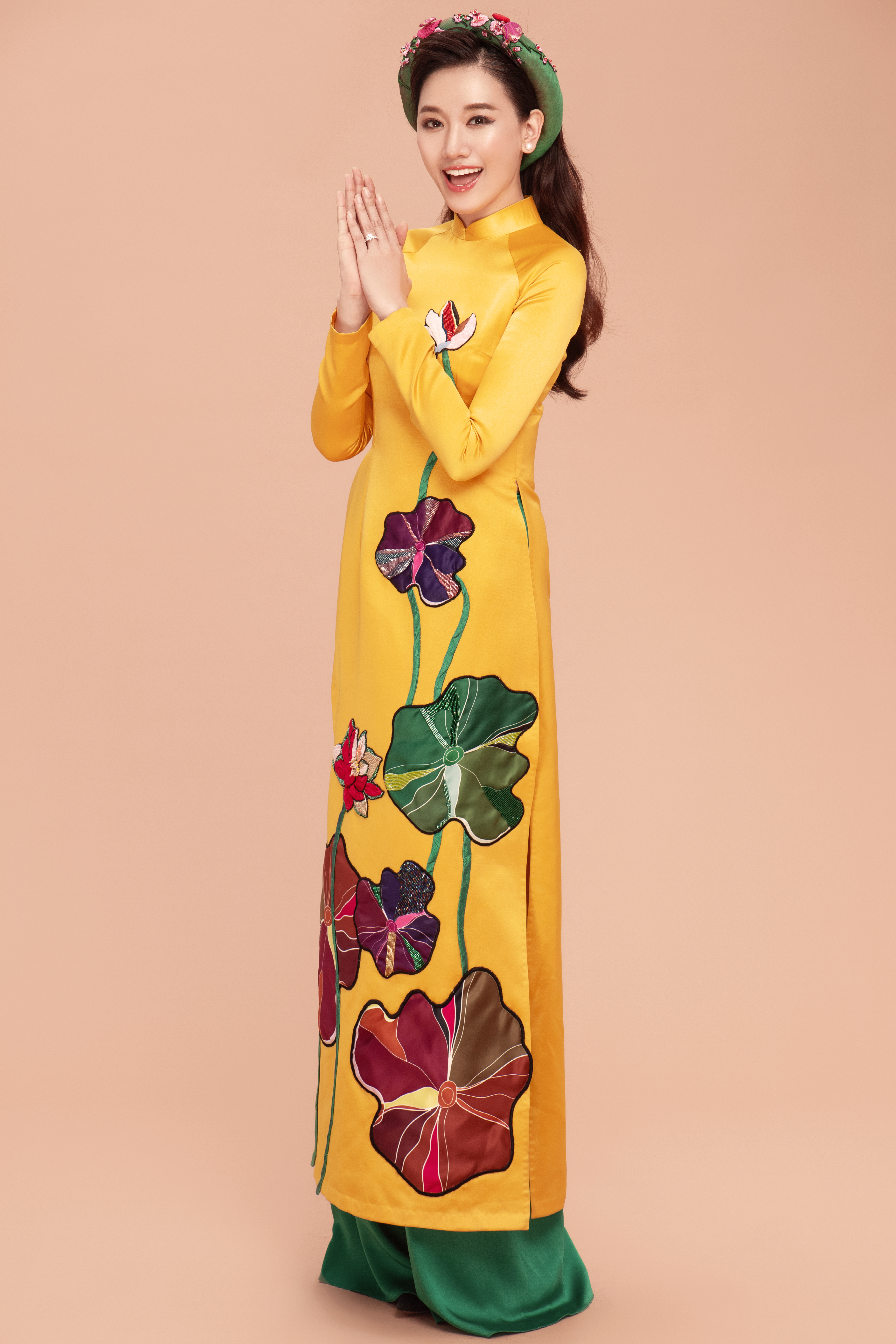 Trong bộ áo dài vàng ươm truyền thống Việt Nam, Hari Won đã được vẻ đẹp ngọt ngào, mặn mà quyến rũ của người con gái Á Đông.