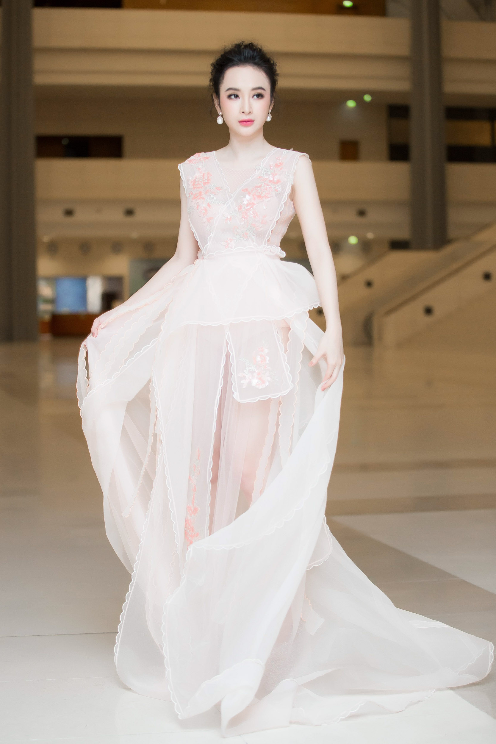 Tối 8/4, Angela Phương Trinh đến tham dự sự kiện của một thương hiệu thời trang tại Hà Nội. Cô diện đầm dạ hội tông hồng kết hợp phần chân váy trong suốt. Tông trang điểm nhẹ cùng mái tóc xoăn tự nhiên được búi cao giúp người đẹp thu hút ánh nhìn ngay khi xuất hiện tại địa điểm tổ chức show diễn.