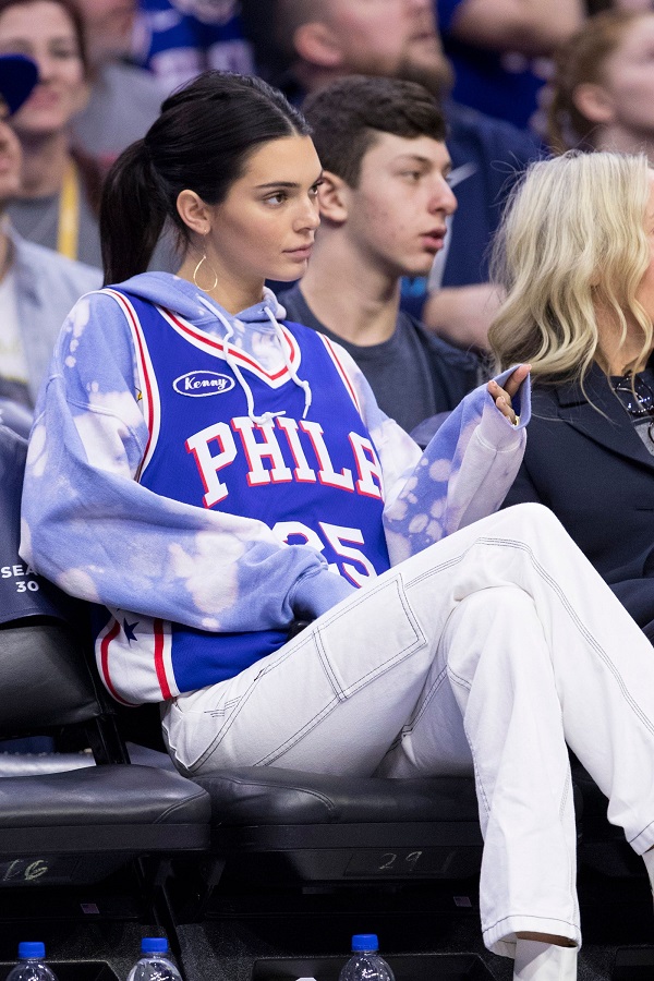 Chân dài triệu đô Kendall Jenner gây chú ý khi diện áo hoodie oversized màu loang xanh pastel mix cùng áo cầu thủ bóng rổ khi cô đi xem một trận đấu thể thao