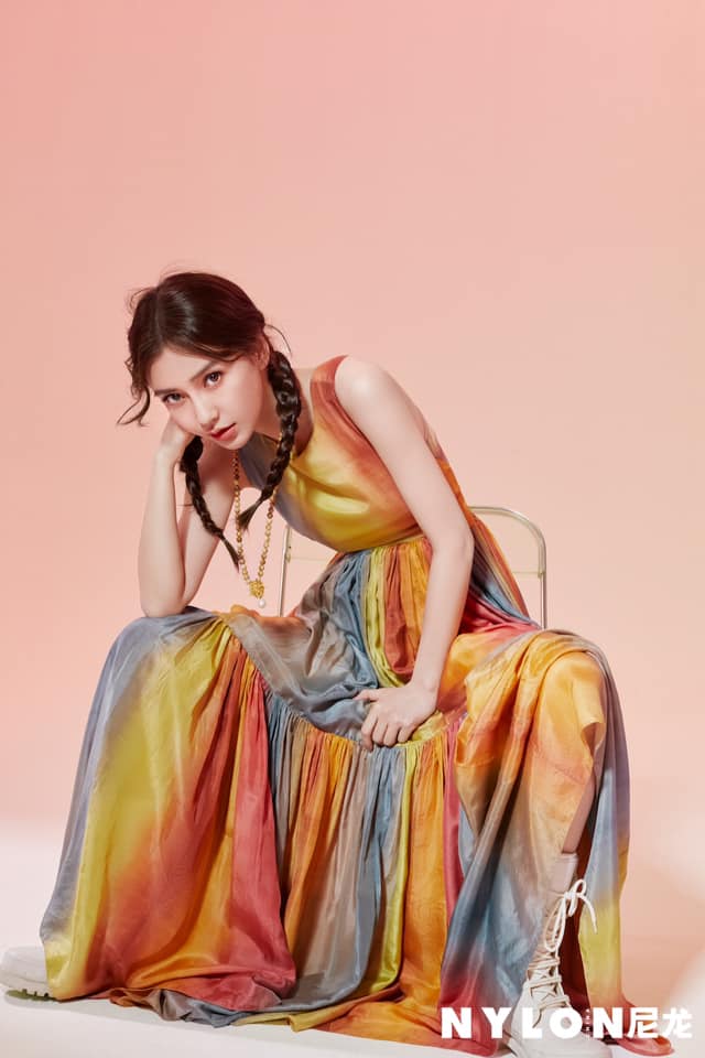 Loạt hình chụp cho tạp chí Nylon China số mới nhất, Angelababy cũng khoe nhan sắc của mình trong kiểu váy xếp ly suông dài loang lổ gam màu mix 7 sắc cầu vồng