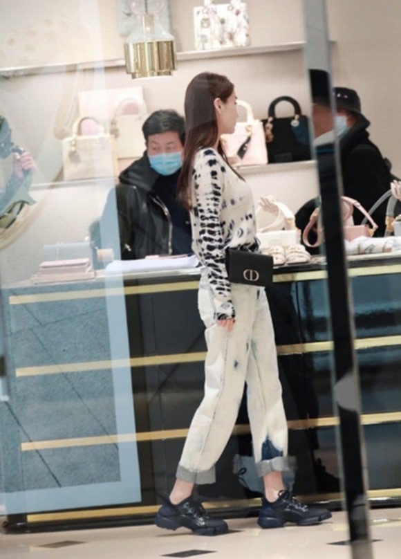 Thậm chí, vợ Huỳnh Hiểu Minh diện nguyên cây loang lổ từ áo đến quần jeans đeo túi thắt lưng ngang eo của nhà Dior khi đi mua sắm