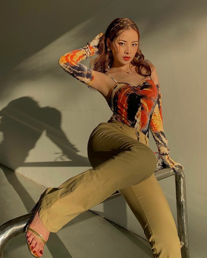 Chi Pu từng diện thiết kế tie-dyet màu cam cháy cool ngầu với phần cut - out ở tay của NTK Kim Shui, đây là trang phục mà từng được Kylie Jenner diện trước đó
