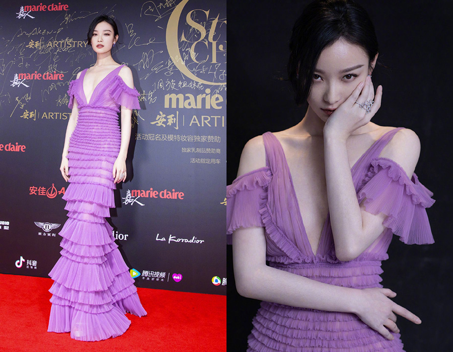 Diễn viên Nghê Ni xinh đẹp trong chiếc váy màu tím Lavender xếp tầng hở vòng 1 lấp ló tại môt sự kiện thời trang vào đầu tháng 12/2018. Sự xuất hiện của cô khiến bao nhiêu cánh mày râu phải xao xuyến.
