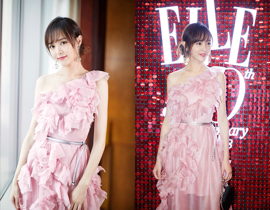 Đường Yên xinh đẹp trong thiết kế váy lệch vai màu hồng phấn tại Lễ kỉ niệm 30 năm thành lập của ELLE Trung Quốc.