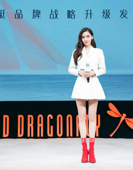 Angelababy xinh đẹp trong chiếc váy vest màu trắng kết hợp cùng với đôi boots cổ ngắn màu đỏ