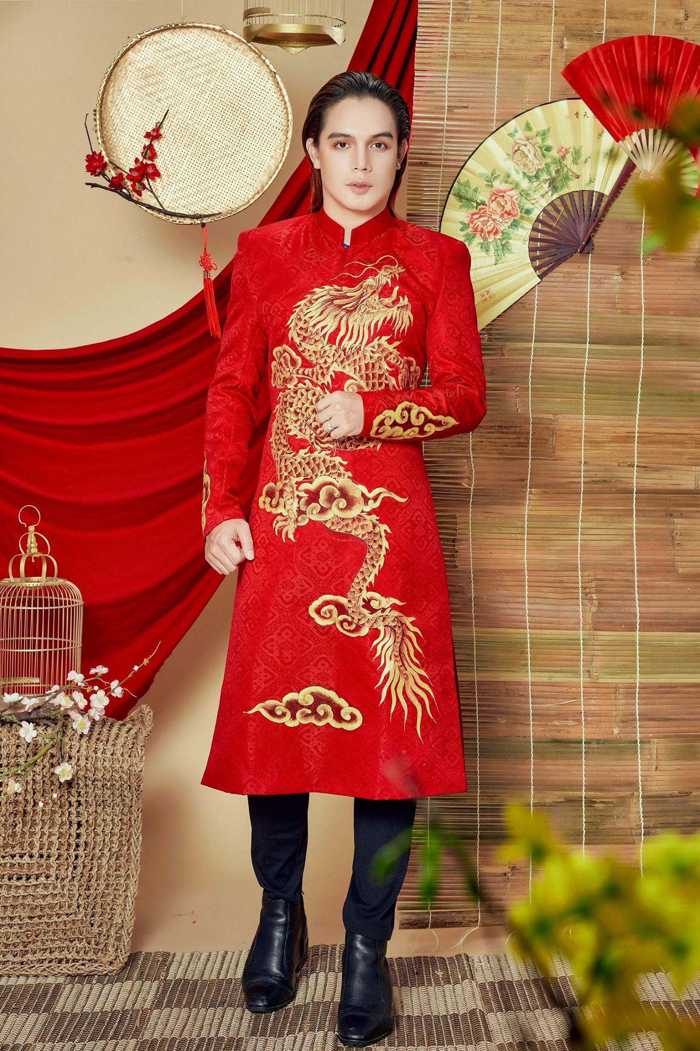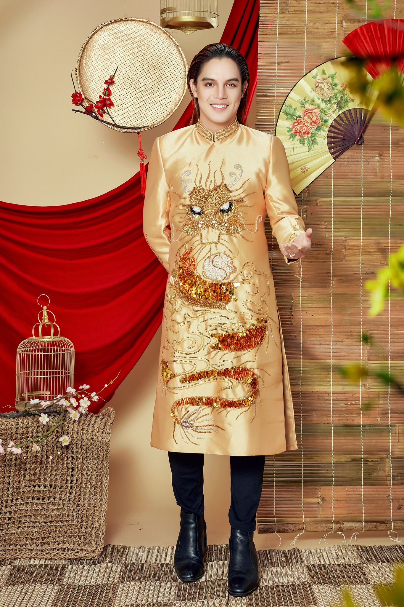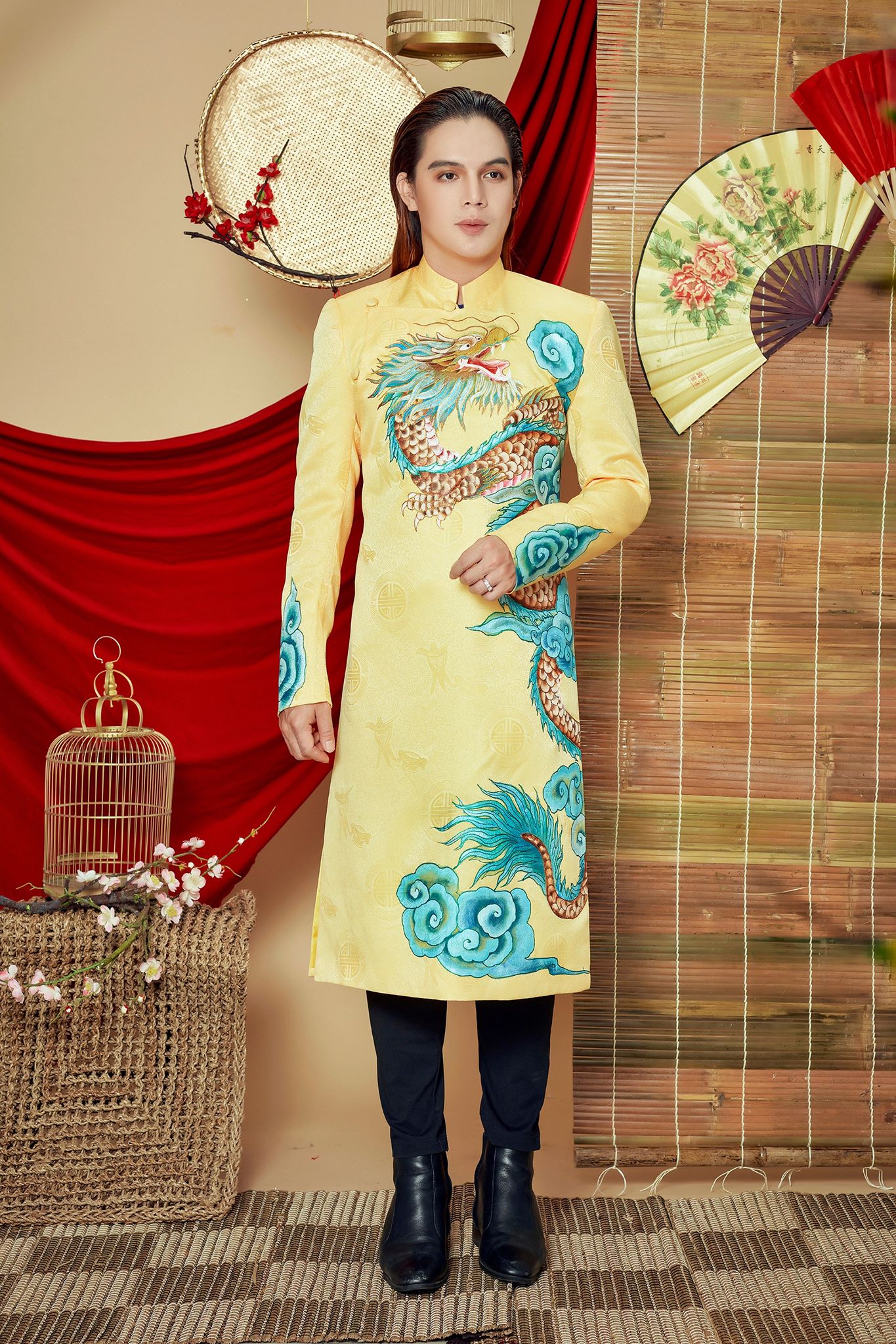 Người xem khó có thể rời mắt khỏi những họa tiết hoa văn cầu kỳ cùng hình ảnh rồng vàng, chim hạc, lân sư được lồng ghép khéo kéo không chỉ tạo nên sự lịch lãm mà còn khiến các đấng mày râu trở nên tinh tế, khác biệt hơn.