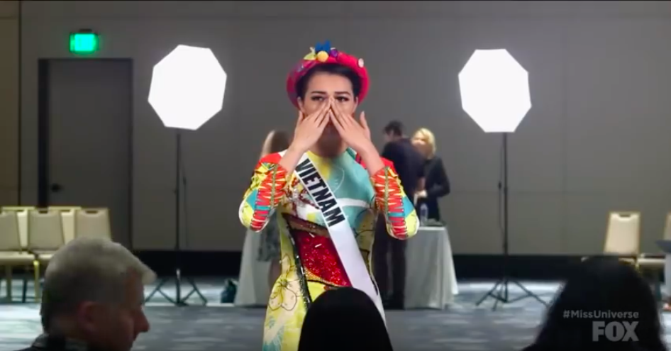 Trong khi đó, Á hậu Lệ Hằng diện áo dài cho phần phỏng vấn kín.