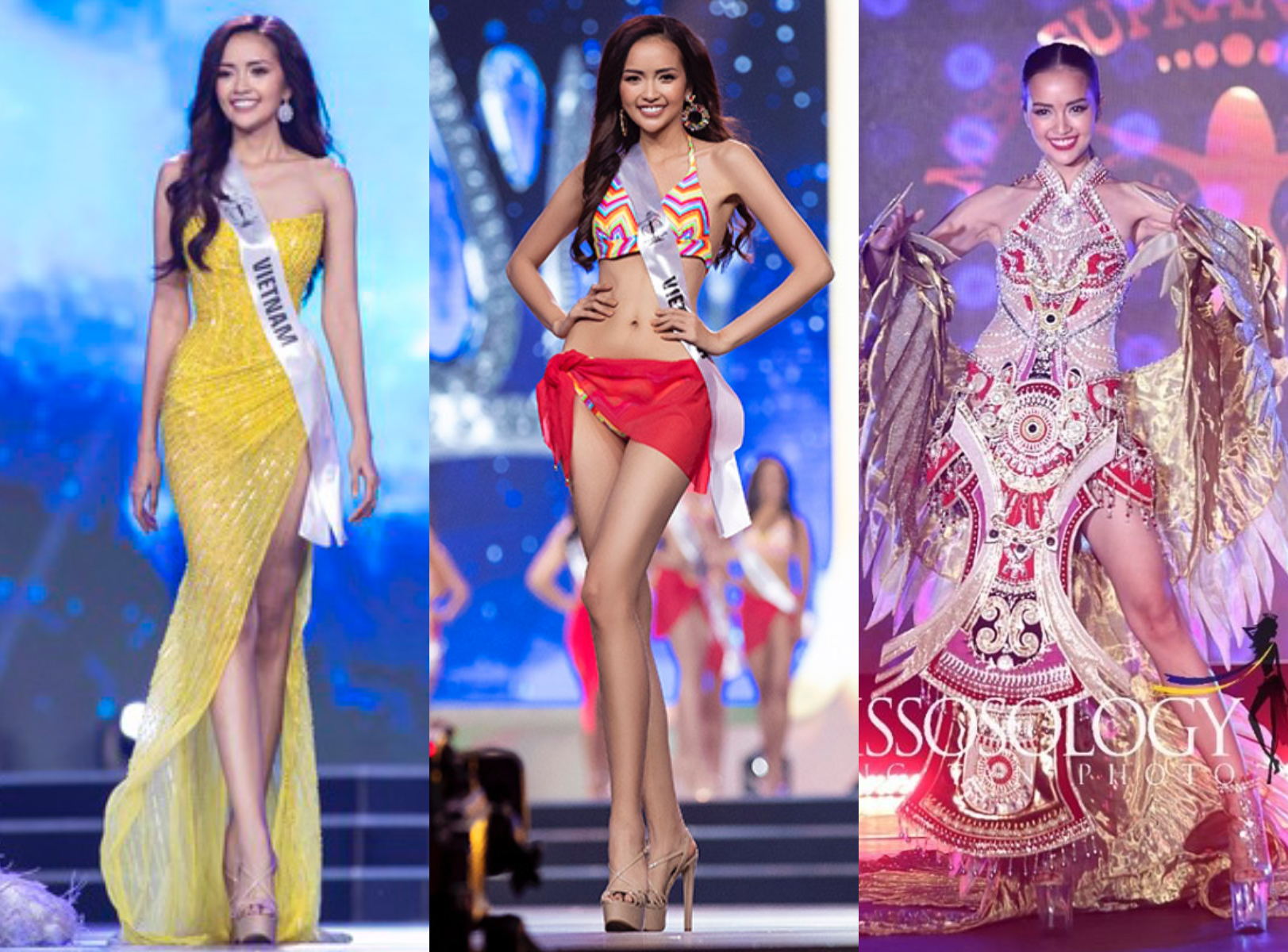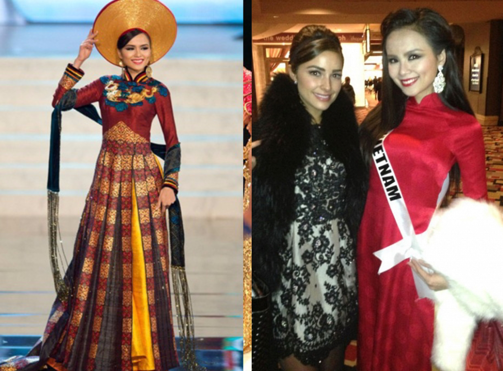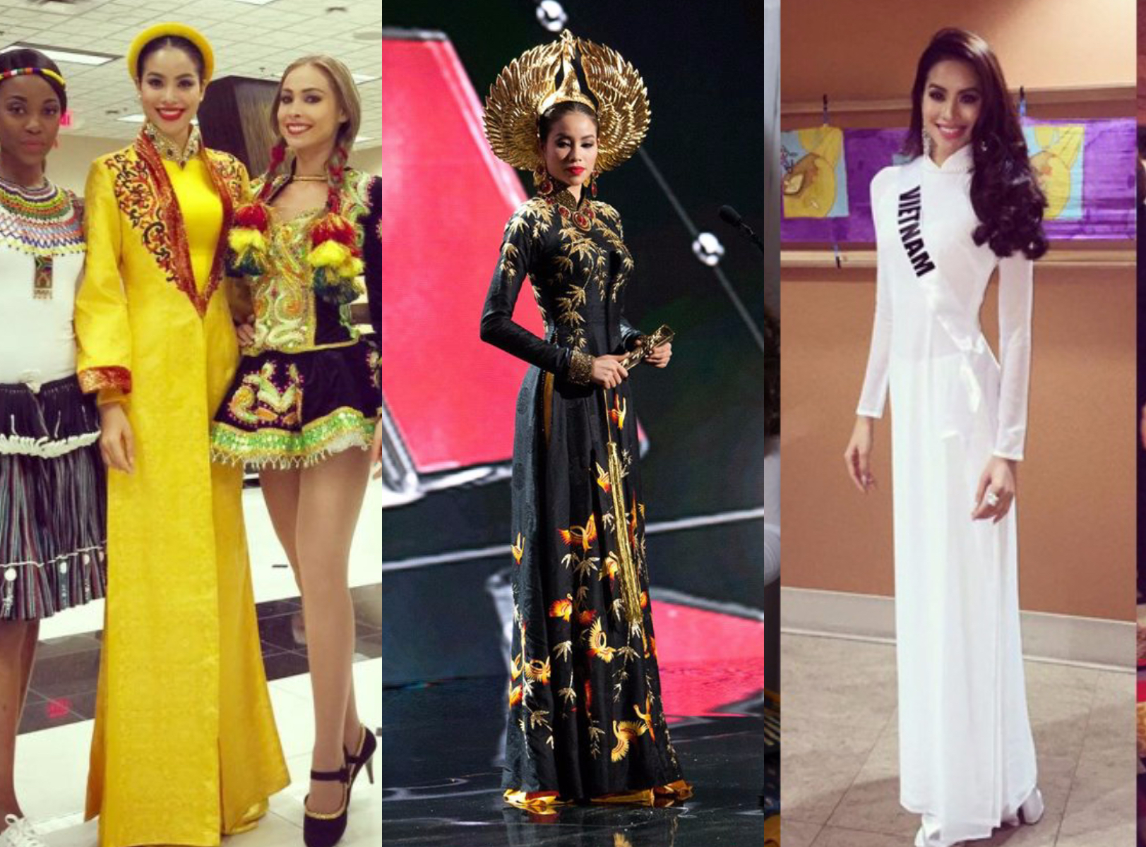 Phạm Hương mặc 3 bộ áo dài tại Hoa hậu Hoàn vũ 2015: Một cho phần thi quốc phục, một cho phần thi tài năng, và một cho hoạt động đấu giá từ thiện. Người đẹp Hải Phòng đạt kỷ lục diện áo dài nhiều nhất so với các mỹ nhân khác khi ra đấu trường quốc tế.