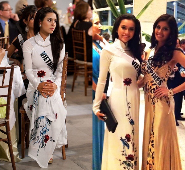 Áo dài được Diễm Hương sử dụng cho phần thi quốc phục và một hoạt động bên bề tại Hoa hậu Hoàn vũ 2012.