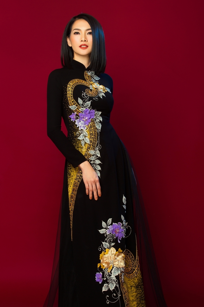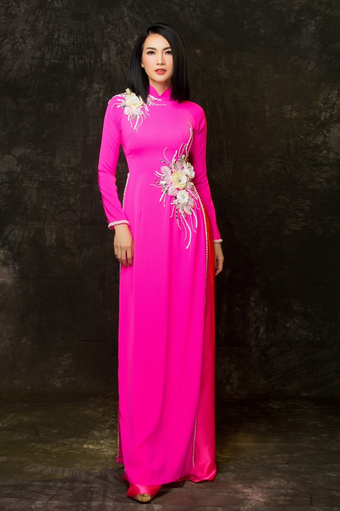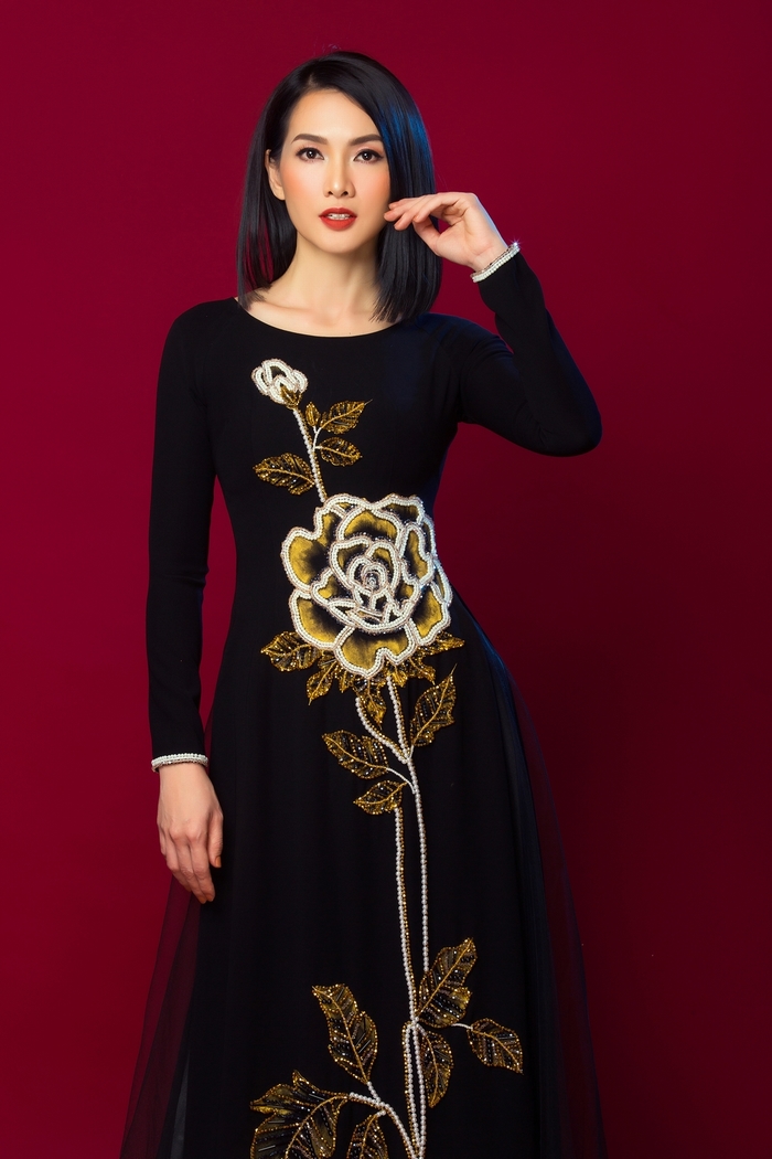 Kỹ thuật kết hoa 3D tạo điểm nhấn cho tà áo dài đặc biệt này. Anh Thư vừa mặn mà, vừa quyến rũ trong thiết kế kỳ công của đàn em.