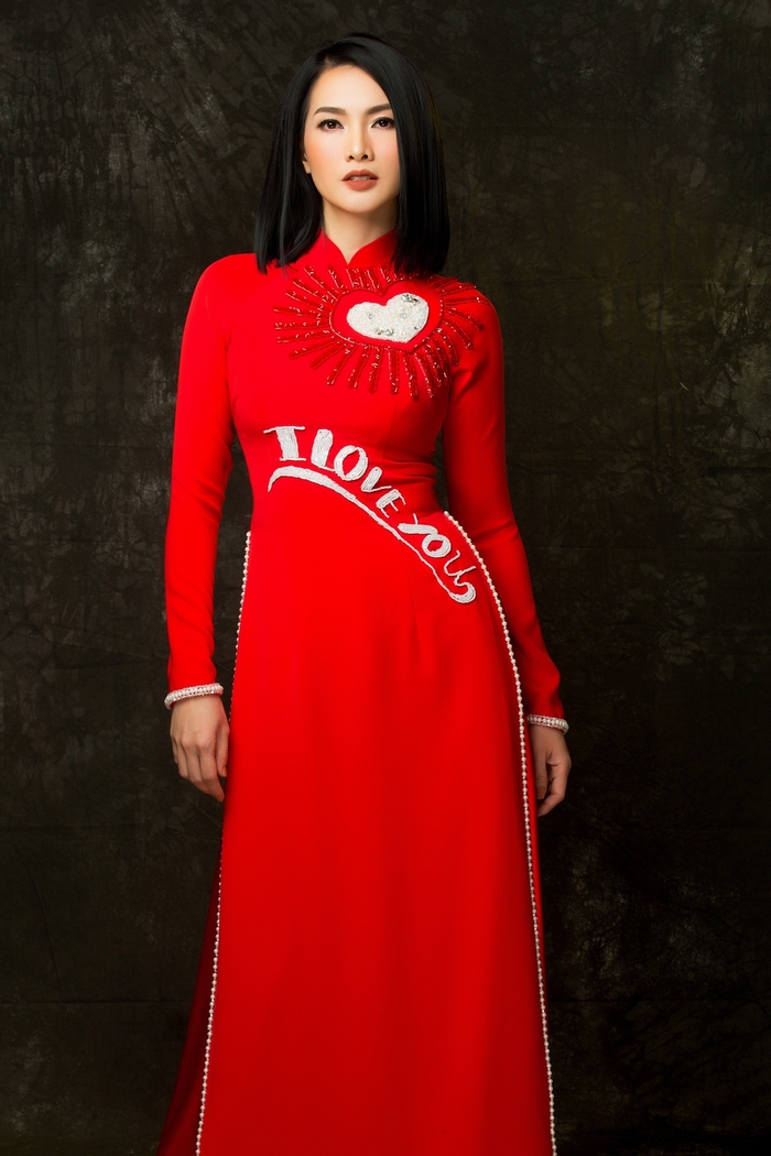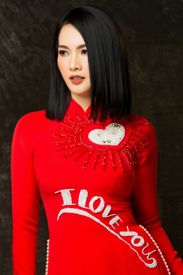 Áo dài cổ thuyền có những hạt gương tinh tế phía trên, giúp người mặc thêm sang trọng. NTK khéo léo thêu những họa tiết ưa nhìn như trái tim, chữ “I Love You”.