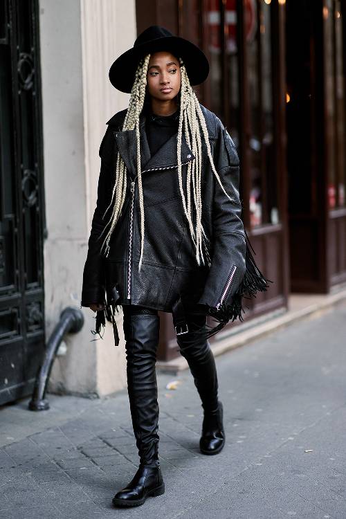 Bộ cánh chất liệu da cá tính nhưng điều mà mọi người chú ý ở tín đồ thời trang này chính là mái tóc thắt cực kì ấn tượng.