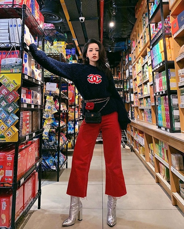 Chi Pu làm nổi bật cho kiểu áo len Chanel đơn điệu của mình bằng cách lên đồ “điệu nghệ” với quần đỏ cùng giày boots màu bạc và túi thắt lưng sành điệu