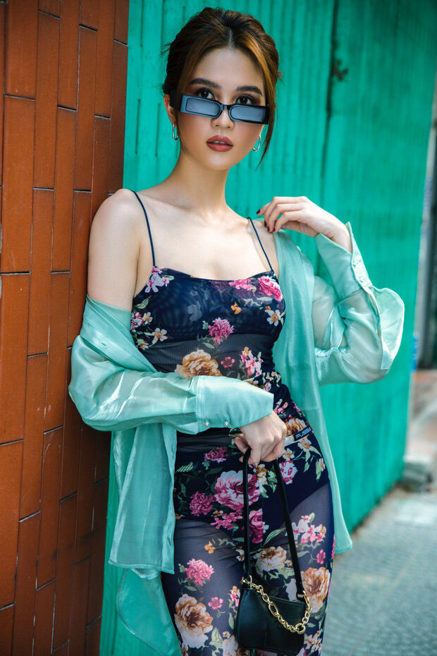 Ngọc Trinh tạo dáng trước ống kính trong set đồ retro xuyên thấu với áo và quần đều có họa tiết hoa, nữ hoàng nội y Việt Nam mix với áo khoác ngoài mỏng manh màu xanh ngọc bích