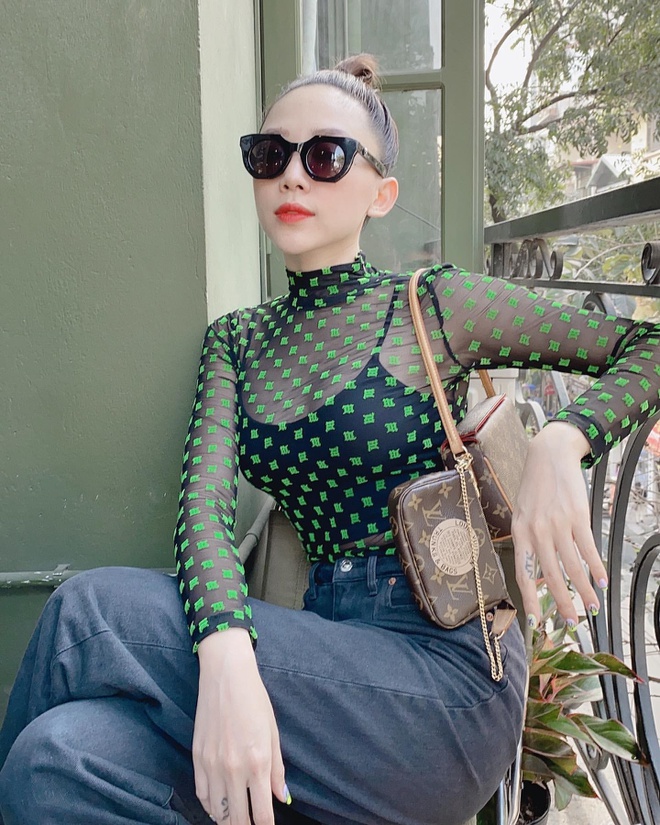 Kiểu áo in logo vải sheer cổ lọ thế này, Tóc Tiên khéo léo chọn một kiểu áo đen hai dây mặc bên trong phối nhịp nhàng với jeans, túi xách và mắt kính đen