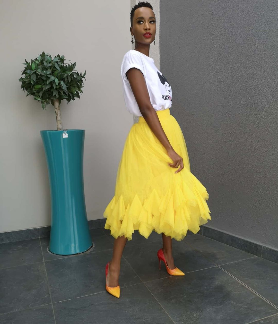 Zozibini Tunzi kết hợp áo thun với chân váy vàng rực rỡ.