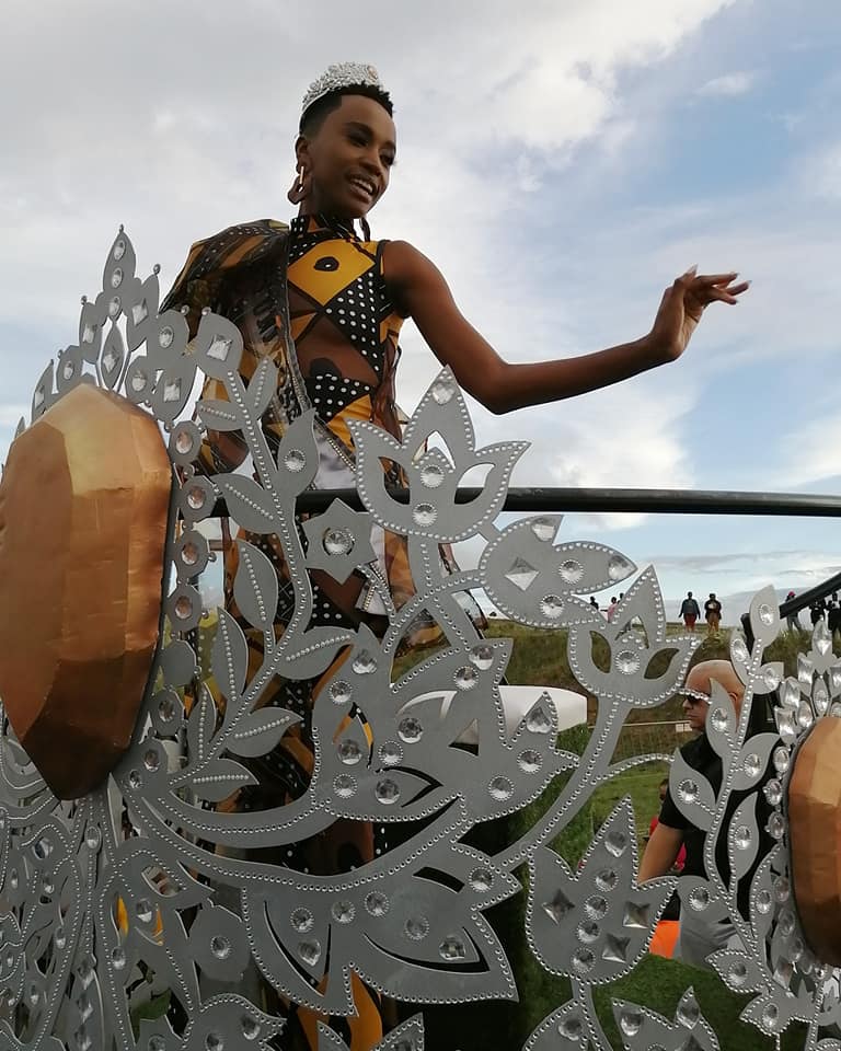 Trong buổi lễ diễu hành ăn mừng chiến tích, Zozibini Tunzi diện thiết kế có hoạ tiết hoa văn mang đặc trưng của những người dân nước này.