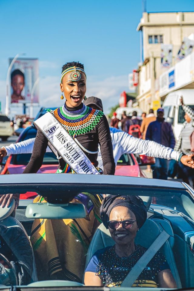 Tương tự trước đó trong lễ diễu hành trên đường phố tỉnh Cape (quê hương của Zozibini Tunzi) khi đăng quang Hoa hậu Nam Phi, cô cũng diện trangp phục của dân tộc mình.