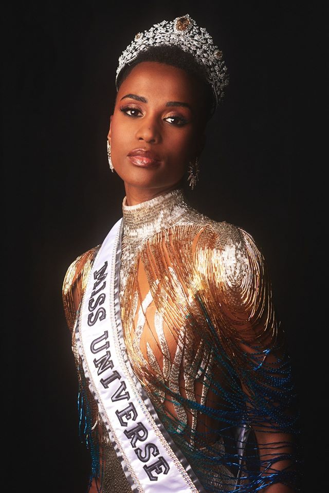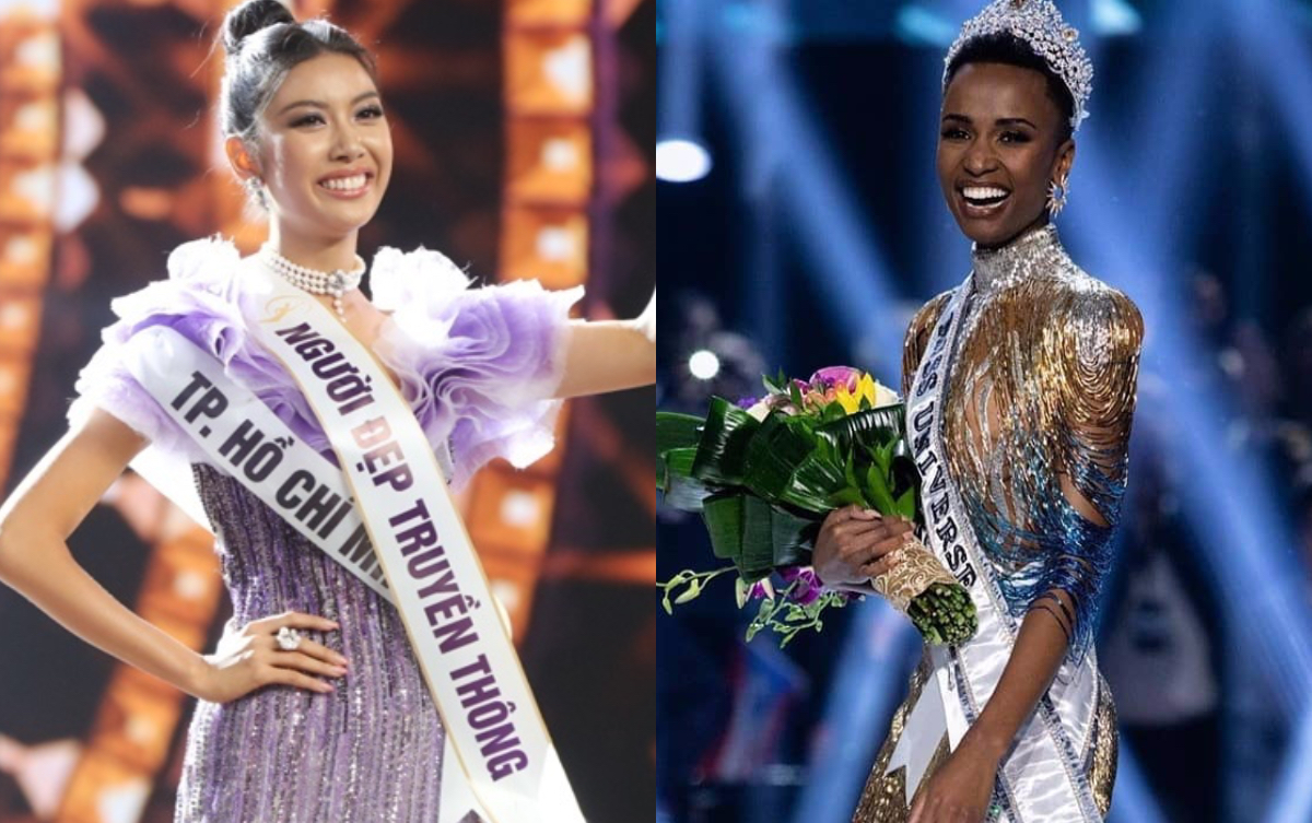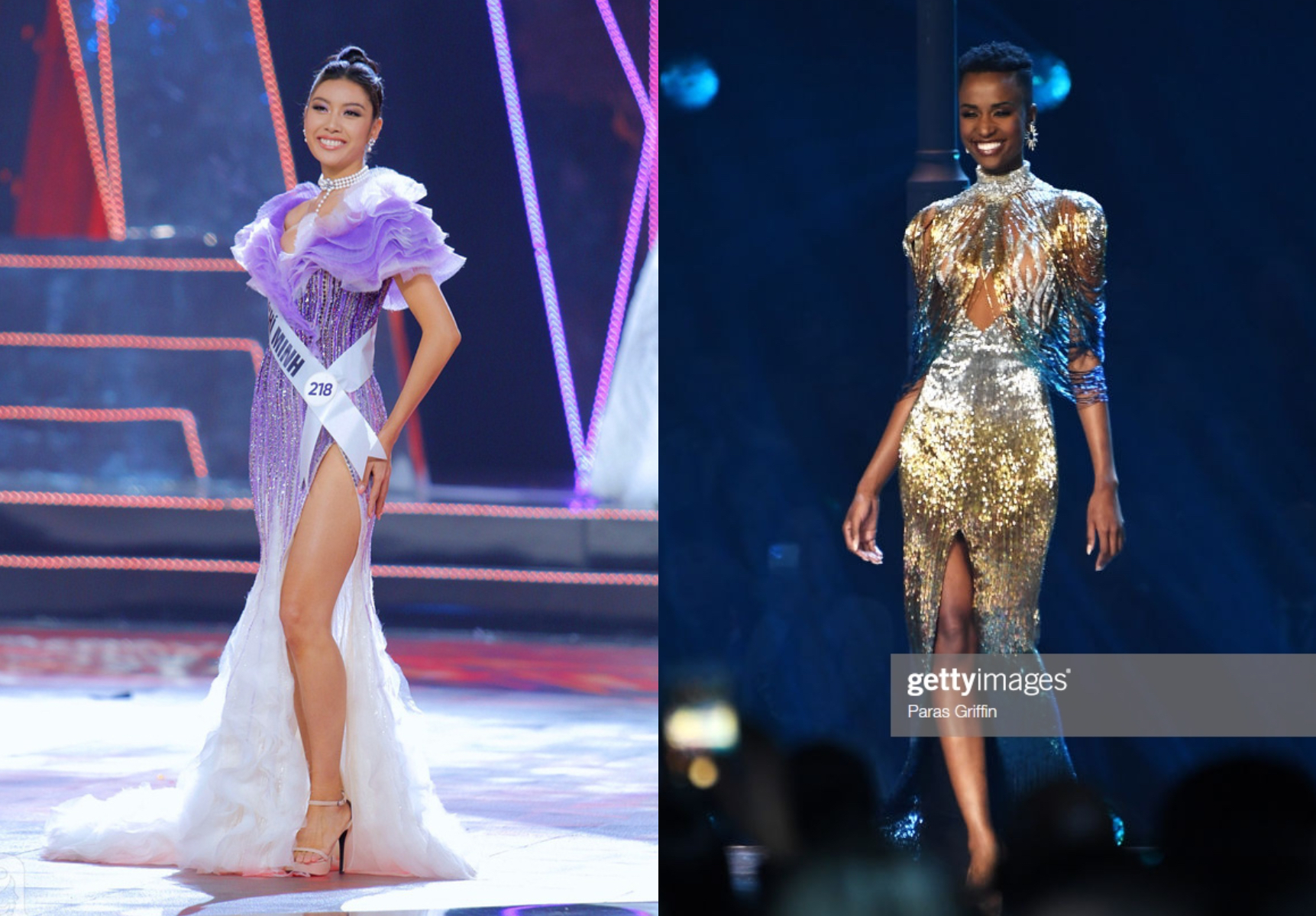 Trái ngược với Thúy Vân người đẹp Nam Phi Zozibini Tunzi lại được hưởng niềm vui chiến thắng tròn trịa. Không biết ngẫu nhiên hay đã có sự tính toán, chiếc váy của tân Miss Universe 2019 diện trong đêm chung kết cũng có cùng tông màu với chiếc vương miện.