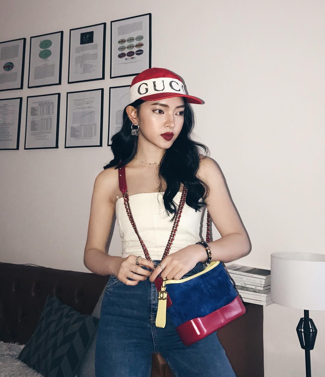 Nón Gucci cùng túi đeo hông cùng thương hiệu, còn ai sành điệu, chất chơi hơn Trâm cơ chứ.
