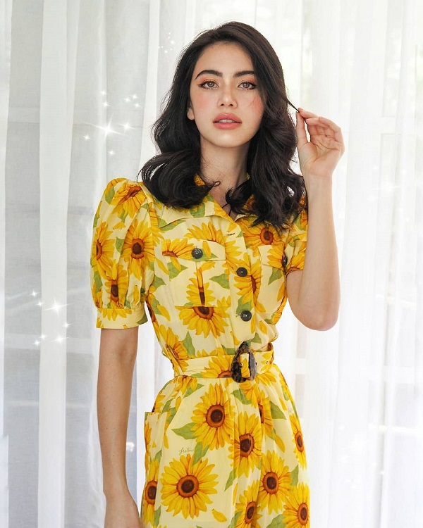 Một nàng “ma nữ” dịu dàng , nữ tính với kiểu váy hoa hướng dương rực rỡ cùng tone makeup cam đào ngọt ngào