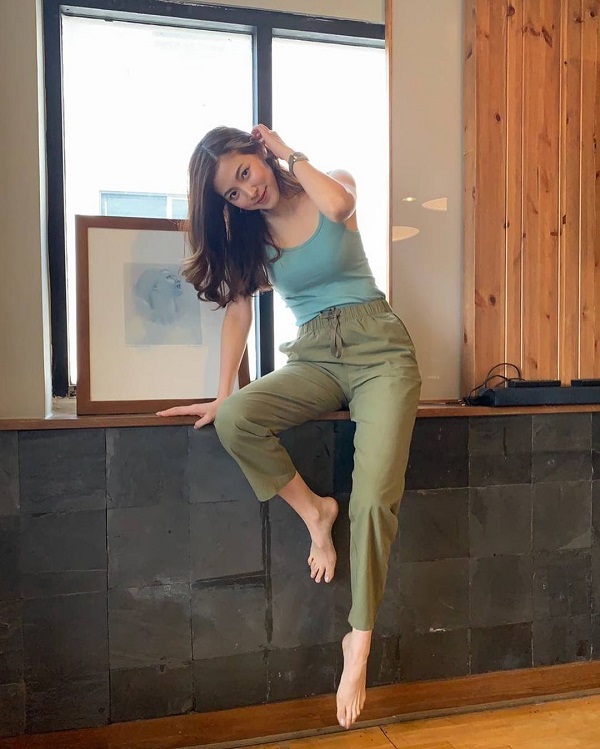 Đổi gió với trang phục thoải mái hơn tí để tập thể dục với áo cotton hai dây cùng quần thun dài màu xanh rêu