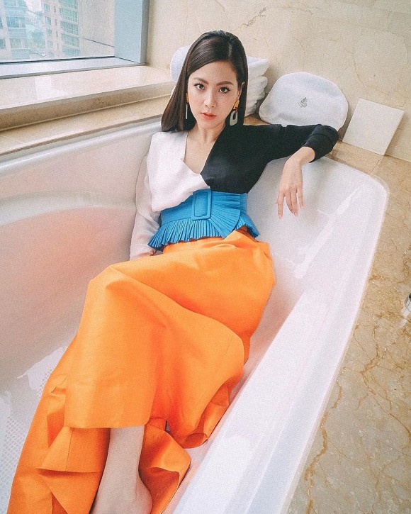 Baifern kiêu sa trong set đồ đậm chất” quý bà” pose dáng trong bồn tắm với áo dài tay mix màu trắng /đen cùng kiểu váy cam suôn dài