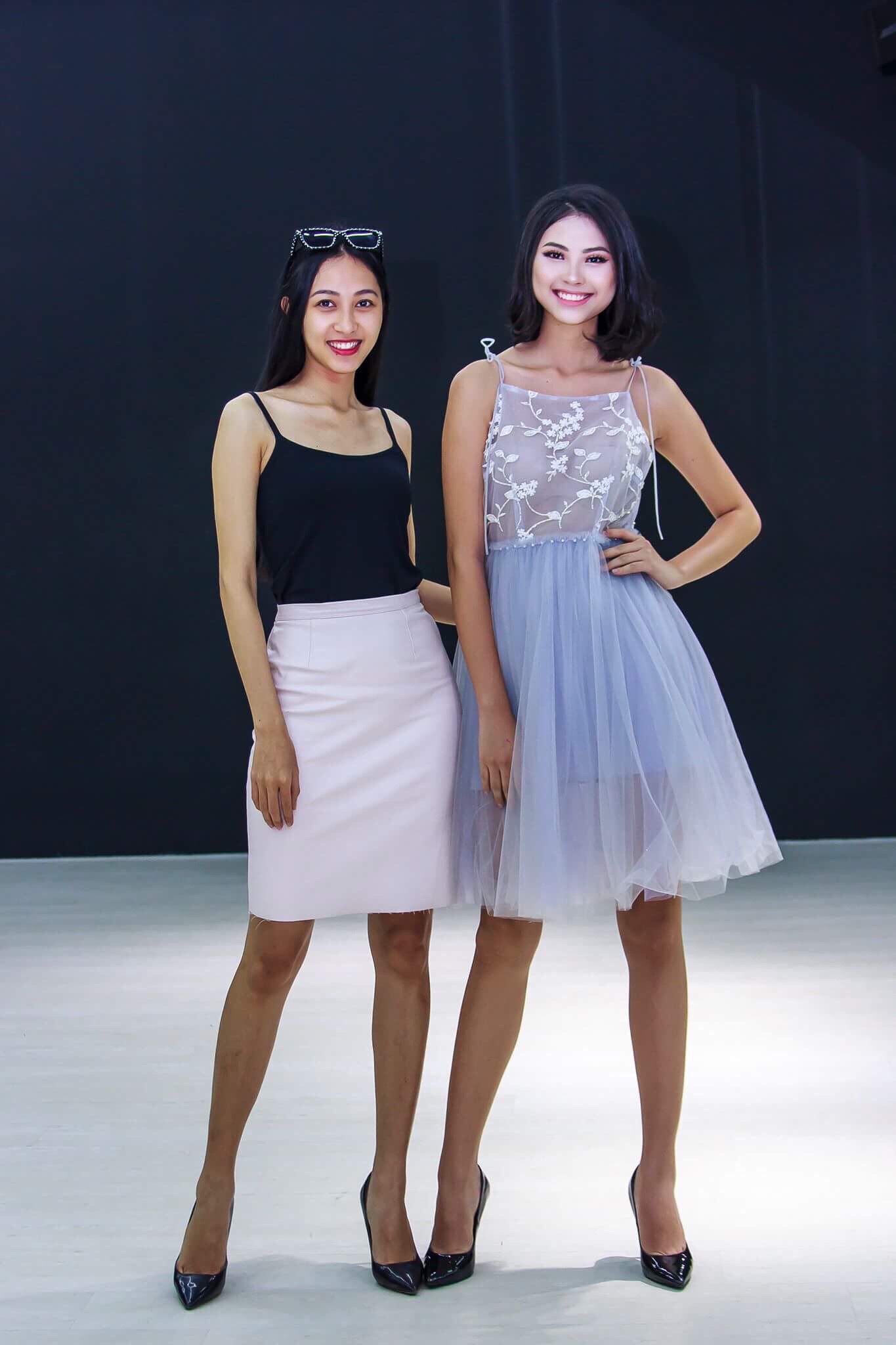 Đào Thị Hà (phải) - “bản sao của Hà Tăng diện đầm 2 dây xuyên thấu ngang gối. Chụp ảnh cùng cô là người mẫu Thu Hiền.