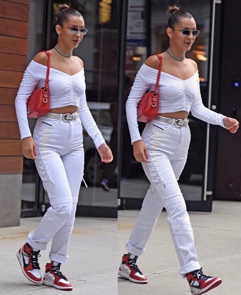 Đây là loại giày dành cho các tín đồ yêu thích sự thoải mái của sneakers nhưng vẫn muốn được trông cao hơn. Hình ảnh năng động, trẻ trung của Bella Hadid trên phố với set đồ phong cách thể thao cá tính.