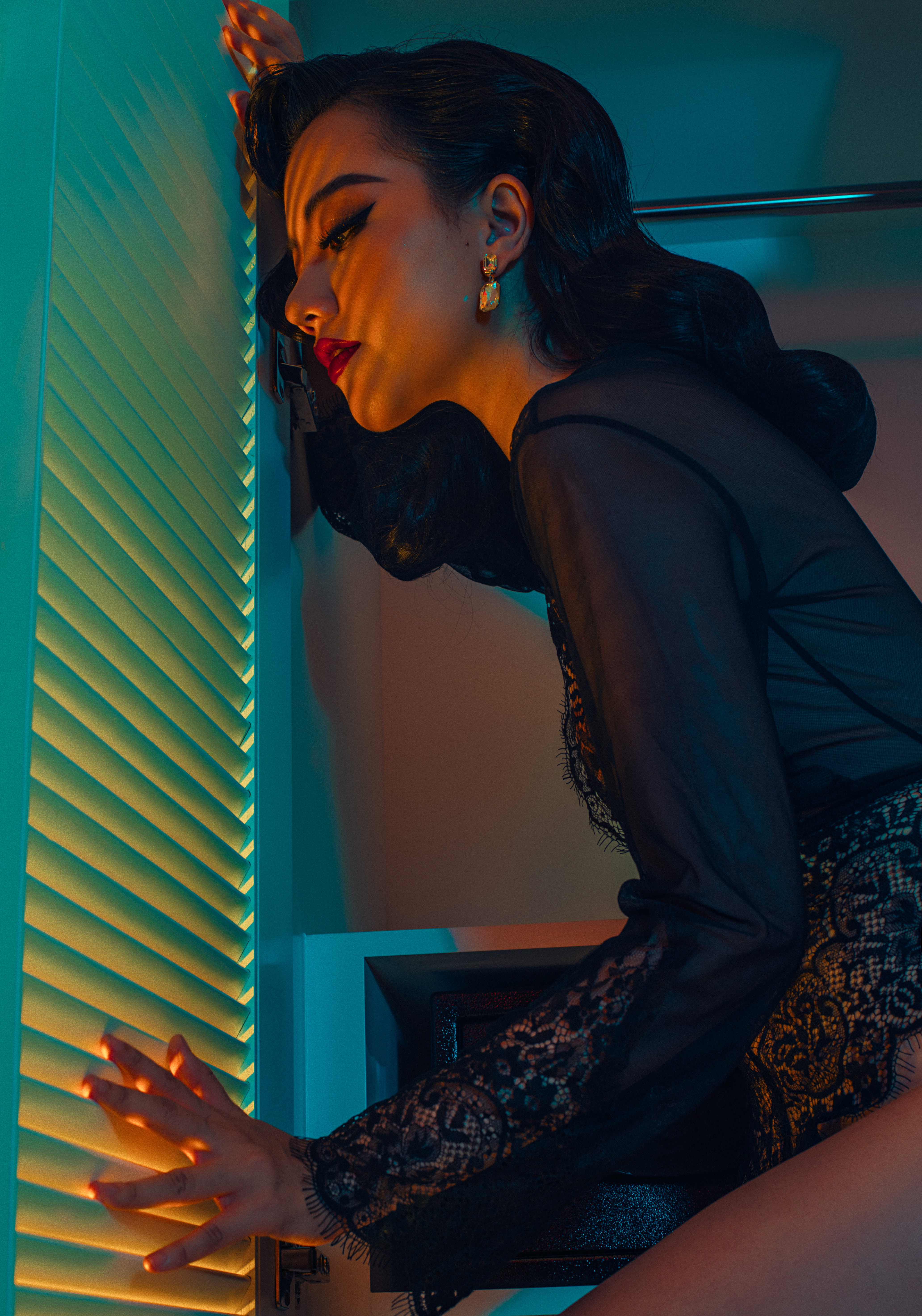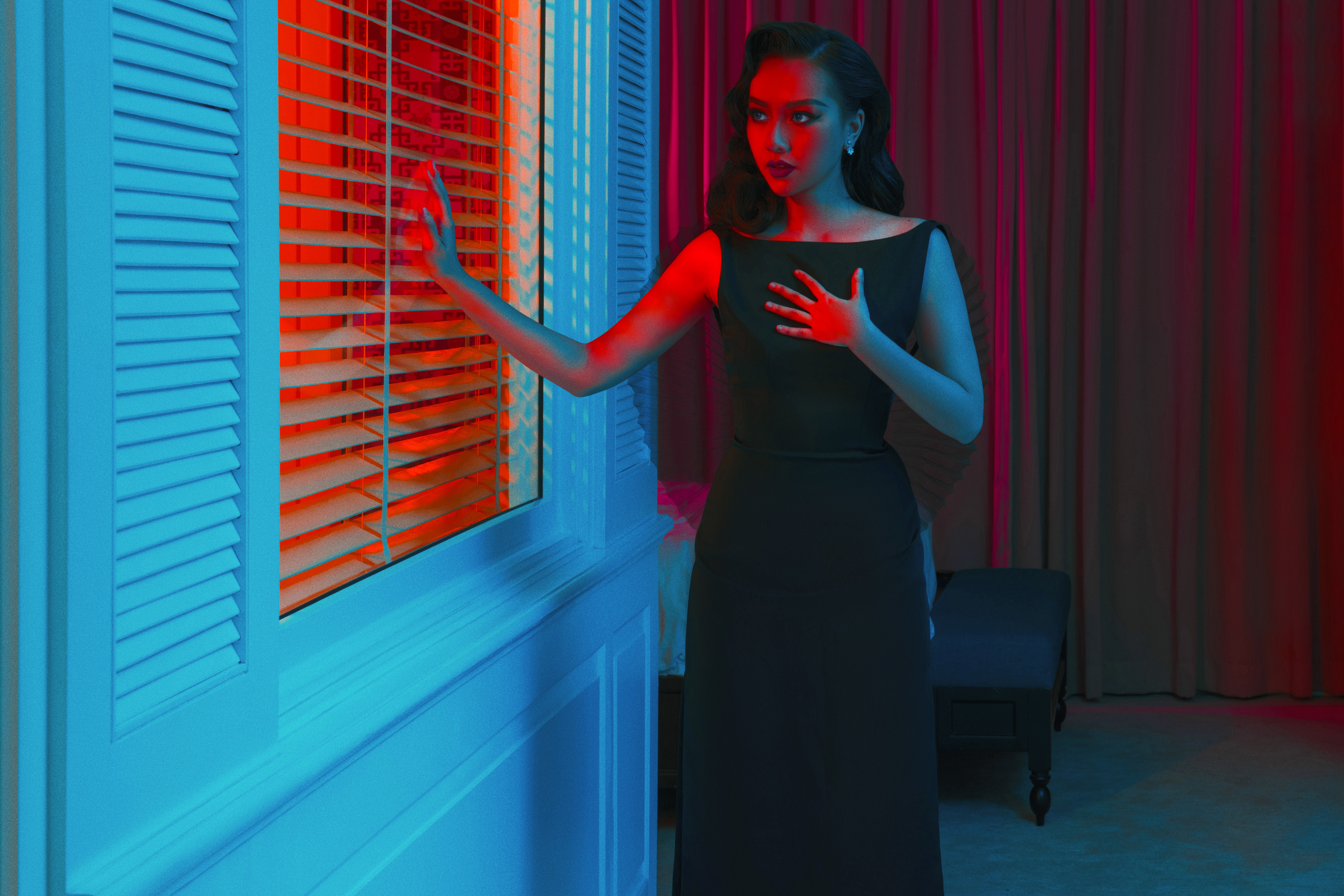 Trong ánh đèn đỏ hiu hắt, Băng Di toát lên vẻ ma mị khi khoác lên mình chiếc đầm đen xẻ lưng. Lựa chọn thiết kế khoe được lợi thế lưng ong thon thả, cô còn thể hiện thần thái sắc lẹm trước ống kính.