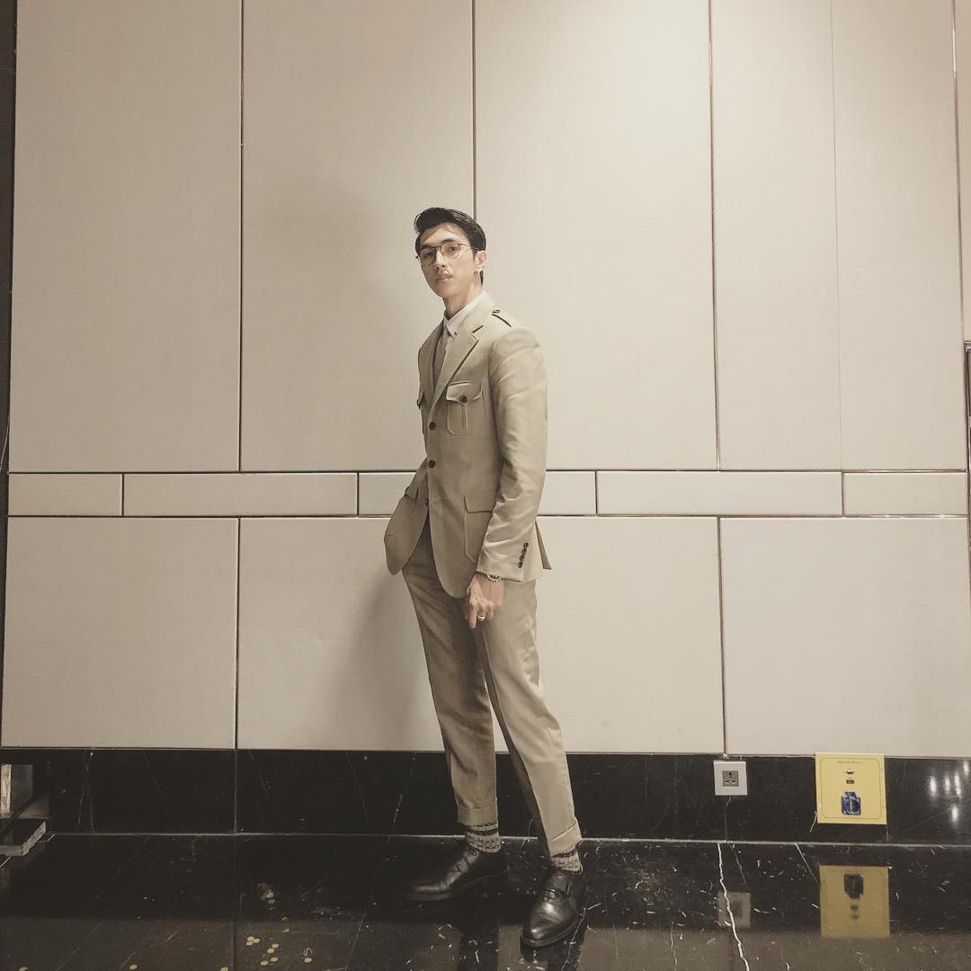 Diễn viên Bình An cực kỳ lịch lãm cùng bộ suit tông màu nâu nhạt, các chi tiết túi đắp cũng góp phần thay đổi cách nhìn quá cứng nhắc về phong cách veston.