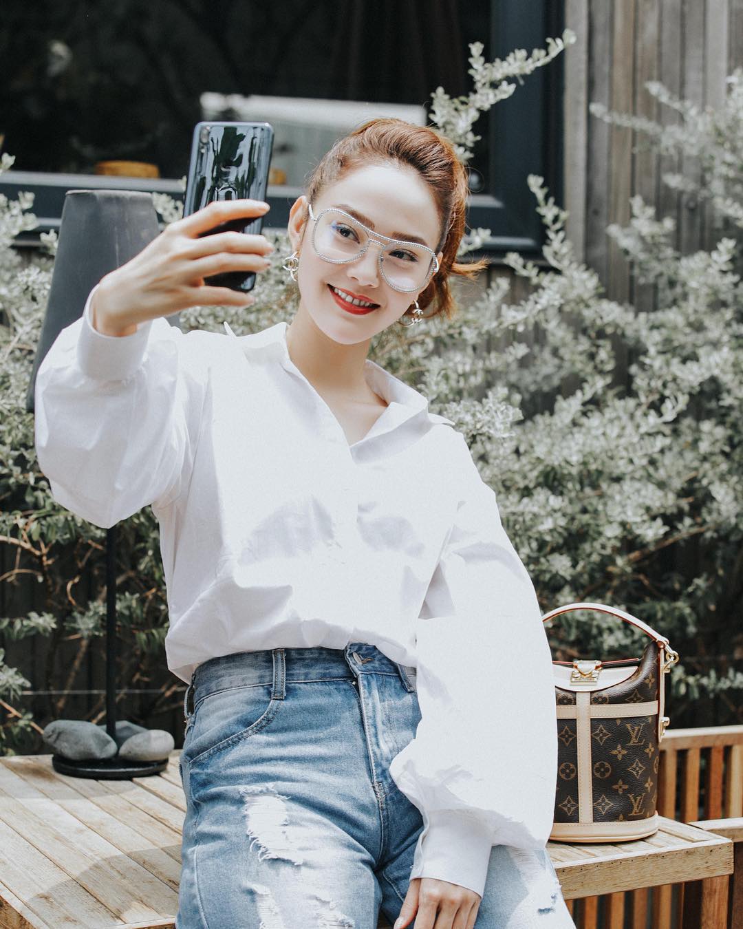 Thay vì sơ mi trắng đơn giản, Minh Hằng chọn kiểu áo tay bồng, tạo vẻ khác lạ, phía xa xa là sự xuất hiện của chiếc túi Sac Duffle đắt đỏ đang được nhiều tín đồ thời trang mê mẩn giá trị lên đến 2.280 USD - hơn 50 triệu đồng.