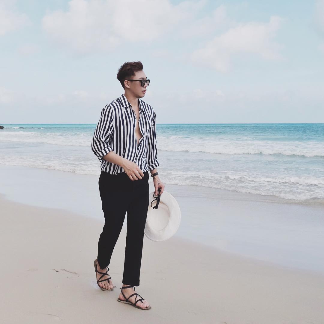 Hoàng Ku trông lịch lãm nhưng vẫn trẻ trung khi diện áo sơ mi sọc cùng quần skinny jeans dạo biển.
