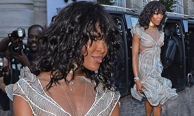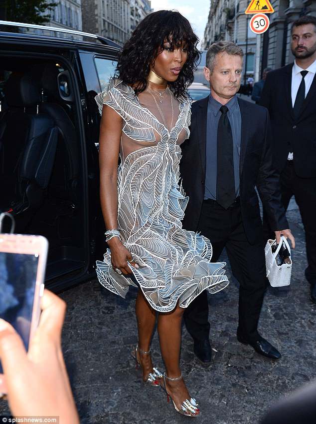 Naomi Campbell chọn một chiếc đầm xuyên thấu với thiết kế 3D lạ mắt vô cùng sexy khoe trọn 80% cơ thể của siêu mẫu sau lớp áo mỏng manh. Bên cạnh đó, bộ trang phục độc đáo như một lưới mạng nhện bao quanh lấy cơ thể Naomi Campbell, tôn lên vóc dáng khiến cô nổi bật và thu hút mọi sự chú ý.
