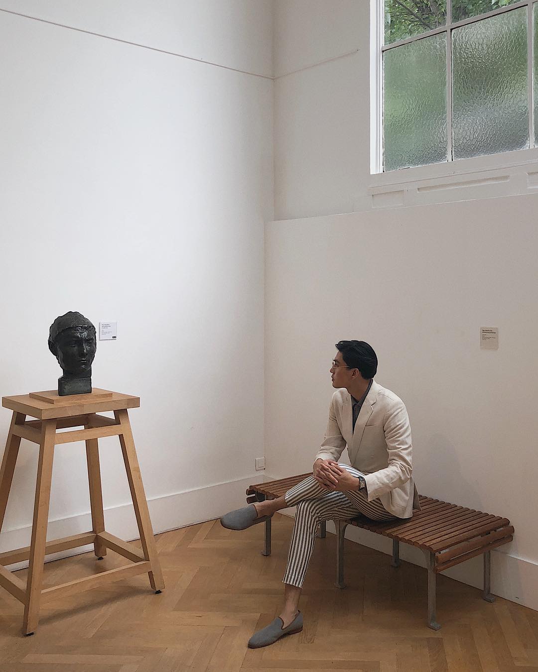 Lịch lãm, thời thượng là phong cách thường trực của người mẫu Quang Đại. Anh chàng xuống phố cùng combo áo blazer và quần kẻ sọc nam tính nhưng chẳng hề già dặn.