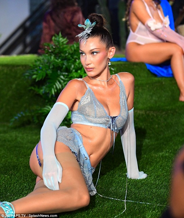 Bella xuất hiện trong bộ đồ lót ren màu xanh biển với mái tóc được búi cao nằm trên bãi cỏ.