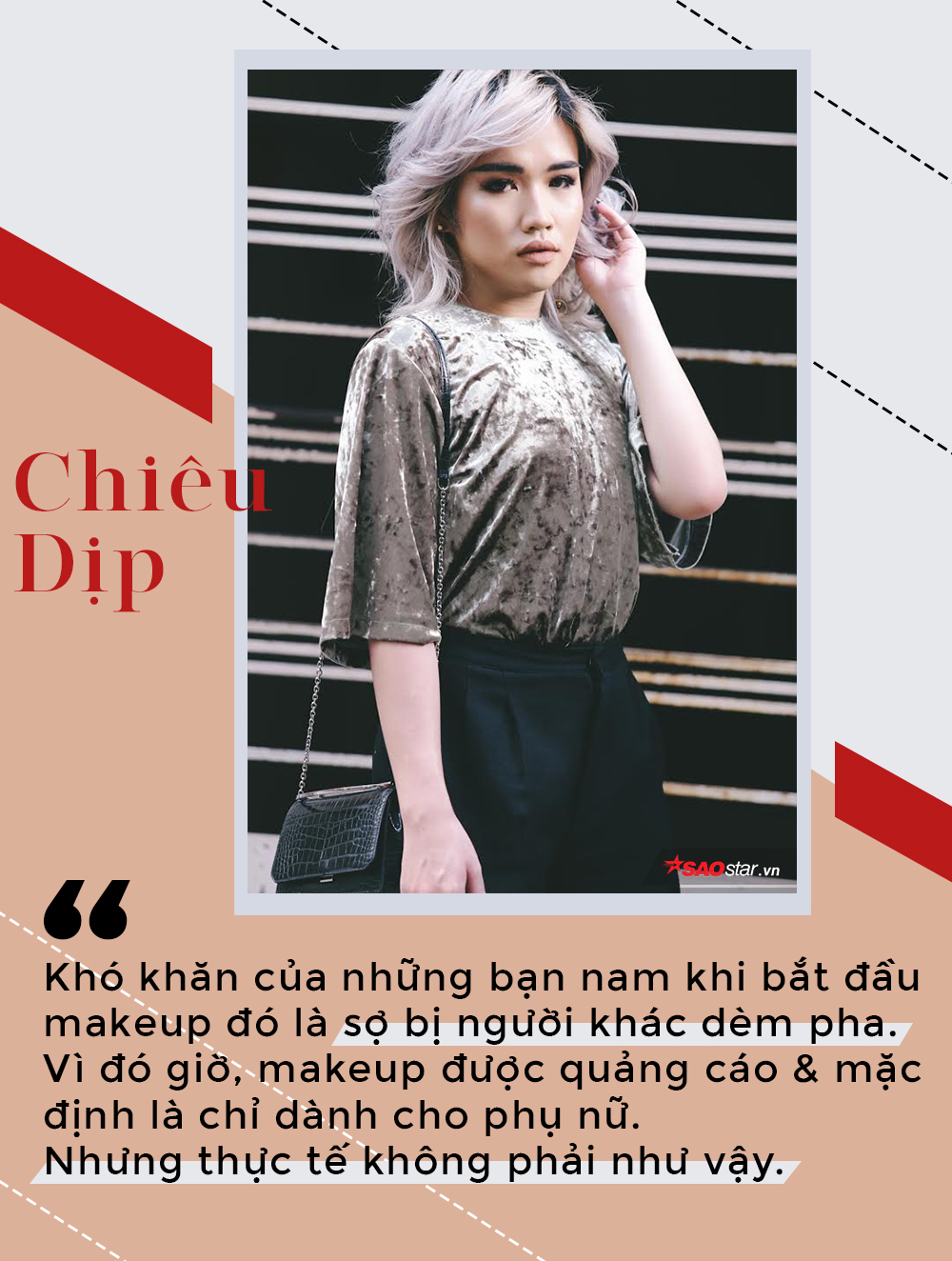 - Khó khăn của những bạn nam khi bắt đầu makeup đó là sợ bị người khác dèm pha. Vì đó giờ, mọi sản phẩm về làm đẹp, trang điểm và cả người mẫu quảng cáo trong lĩnh vực này chỉ duy nhất dành cho nữ giới. Thế nhưng, theo Chiêu thì thời thế đã thay đổi, nhìn quảng cáo của mỹ phẩm Covergirl là thấy, make up artist đồng thời là youtuber chuyên về make up James Charles chính là gương mặt đại diện mới trong năm 2017 là minh chứng rõ rệt nhất.
