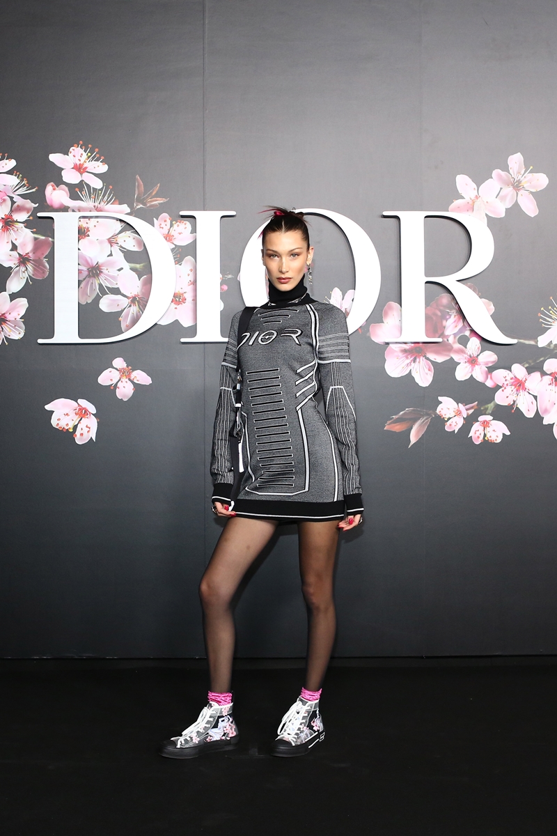 Bella Hadid mặc thiết kế của Dior Homme. Váy đầm ôm sát màu xám kẻ sọc phối với đôi giày sneaker.