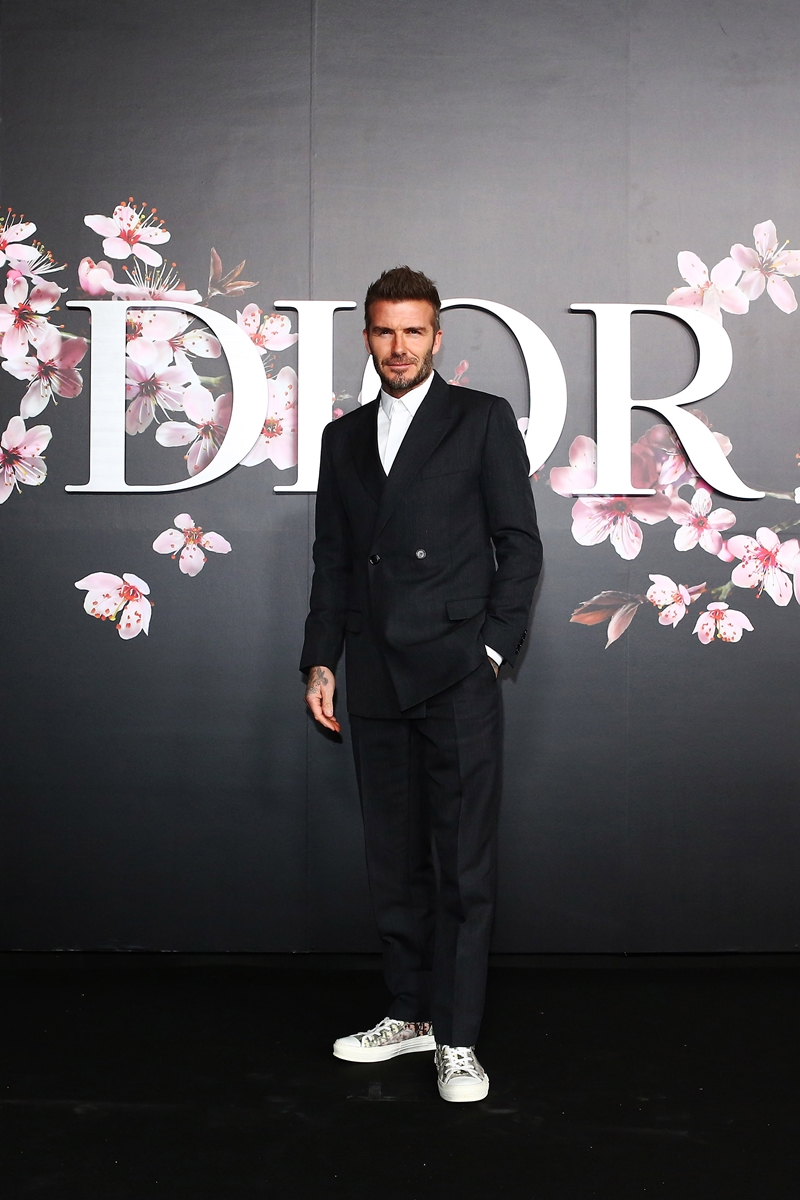 David Beckham lịch lãm trong bộ suit đen cùng giày sneakers mang họa tiết Oblique của Dior Homme.