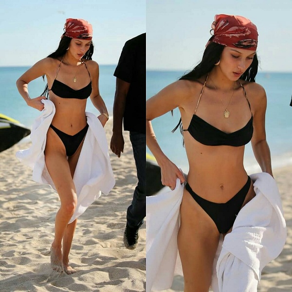 Bella Hadid mặc bikini đen với quần lót được kéo cao mix cùng jeans cạp trễ khi cô xuất hiện tại bãi biển Miami