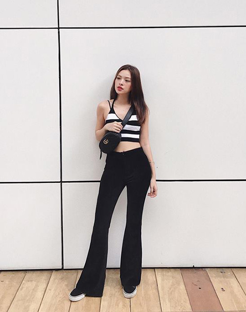 Tú Hảo ưa chuộng lối ăn diện crotop line trắng đen khoe eo thon, đi kèm quần uống suông loe phủ qua giày có tác dụng giúp ăn gian chiều cao đáng kể.