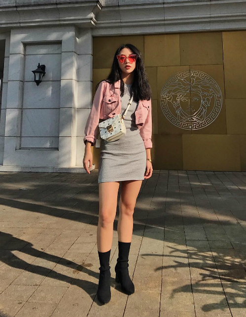 Quỳnh Anh Shyn diện váy len bó sát khoe dáng chuẩn, layer cùng một chiếc áo denim dáng ngắn màu hồng để tăng độ trẻ trung. Ngoài ra, không thể không nhắc đến key items mắt kính trong suốt màu đỏ mà nàng hot girl đang sử dụng giúp hoàn thiện bộ cánh.