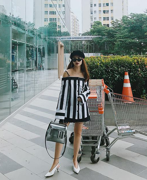 Không hổ danh là một trong những sao nữ có gout thẩm mỹ tinh tế nhất showbiz, Yến Trang thu hút ánh nhìn với chiếc váy sọc trắng đen lấy cảm hứng từ áo sơmi, phối cùng giày mũi nhọn hiện đại kèm túi xách bản lớn, tông ánh bạc và cũng không quên cập nhật cho mình chiếc mũ nồi màu đen đang hot hiện nay.